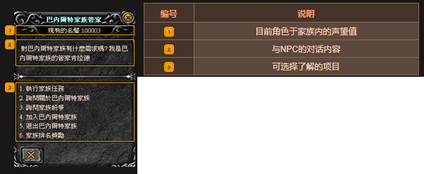 玩家在互相对立的势力「多普瑞恩」家族与「巴内尔特」家族择一加入后透过与对方势力的PVP获得家族名声与奖励的一种势力系统